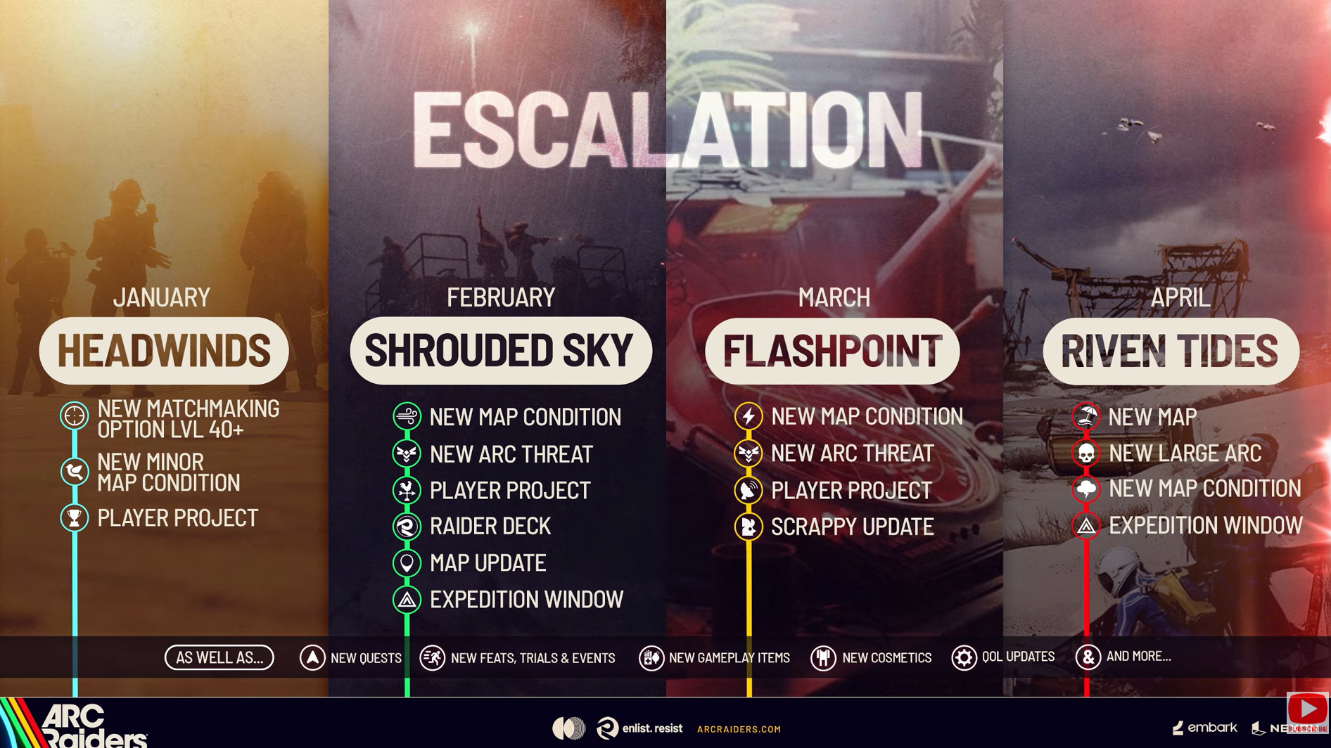 遮蔽天空并不是添加新地图的更新。该产品将于 4 月随 Riven Tides 一起发布,其中还引入了新的大型 ARC。三月的 Flashpoint 更新位于它们之间,带来了另一个地图条件、另一个 ARC 威胁、一个玩家项目和一个 Scrappy 更新。升级路线图仅涵盖一月至四月; Embark 已经透露了该窗口之外的其他内容,但没有具体说明。